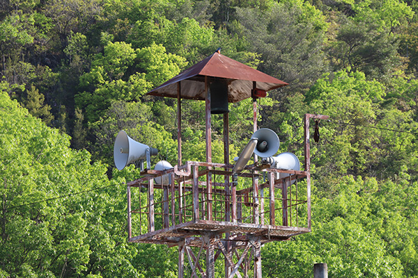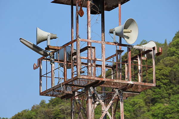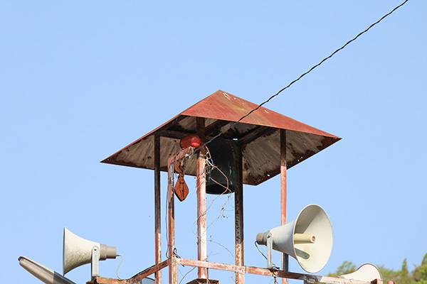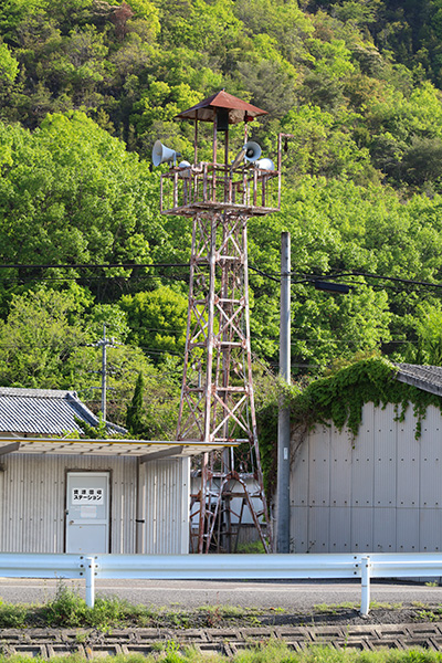 見張台は四角形で、手摺と外縁部は等辺山形鋼製、垂直材は2本に1本が等辺山形鋼製、残りが丸鋼製、水平材は丸鋼製。スピーカーが四方へ向けて取り付けられている。床版はエキスパンドメタル製。