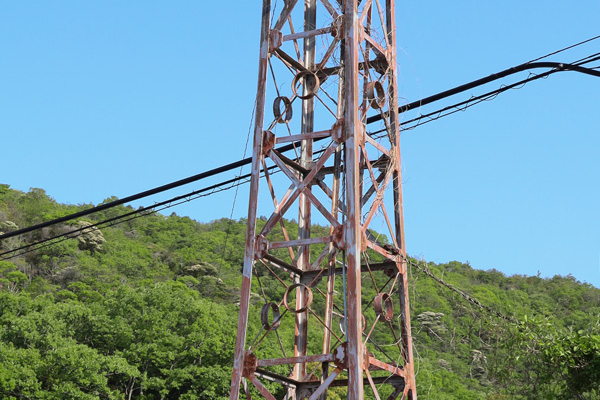 脚は四本で、主材と水平材は等辺山形鋼製、斜材は一節ごとに、丸鋼をリング状のバックルで締結したものと、平鋼をX字状に組んだものが交互に配されている。